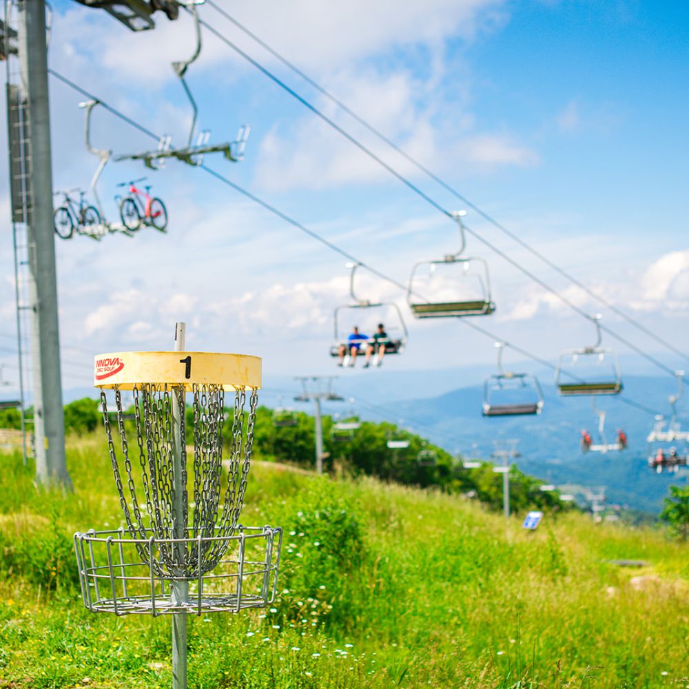 Beech Mountain Resort's 18-hole disc (frisbee) golf course offers a refreshing twist on the classic game by turning the ski slopes into a high-altitude playground.