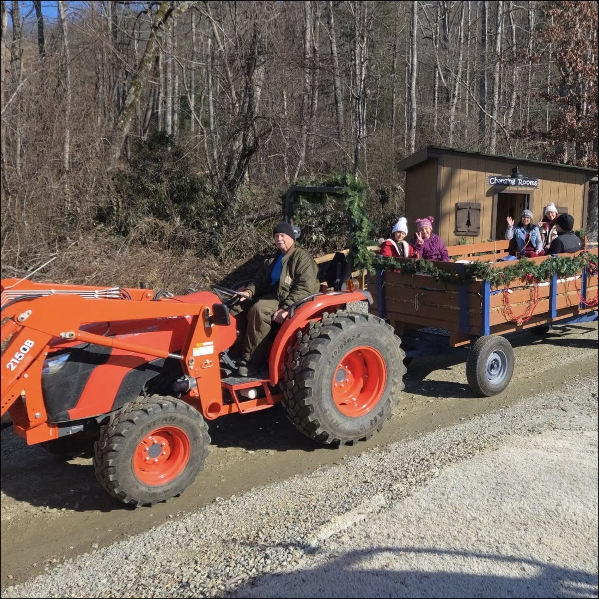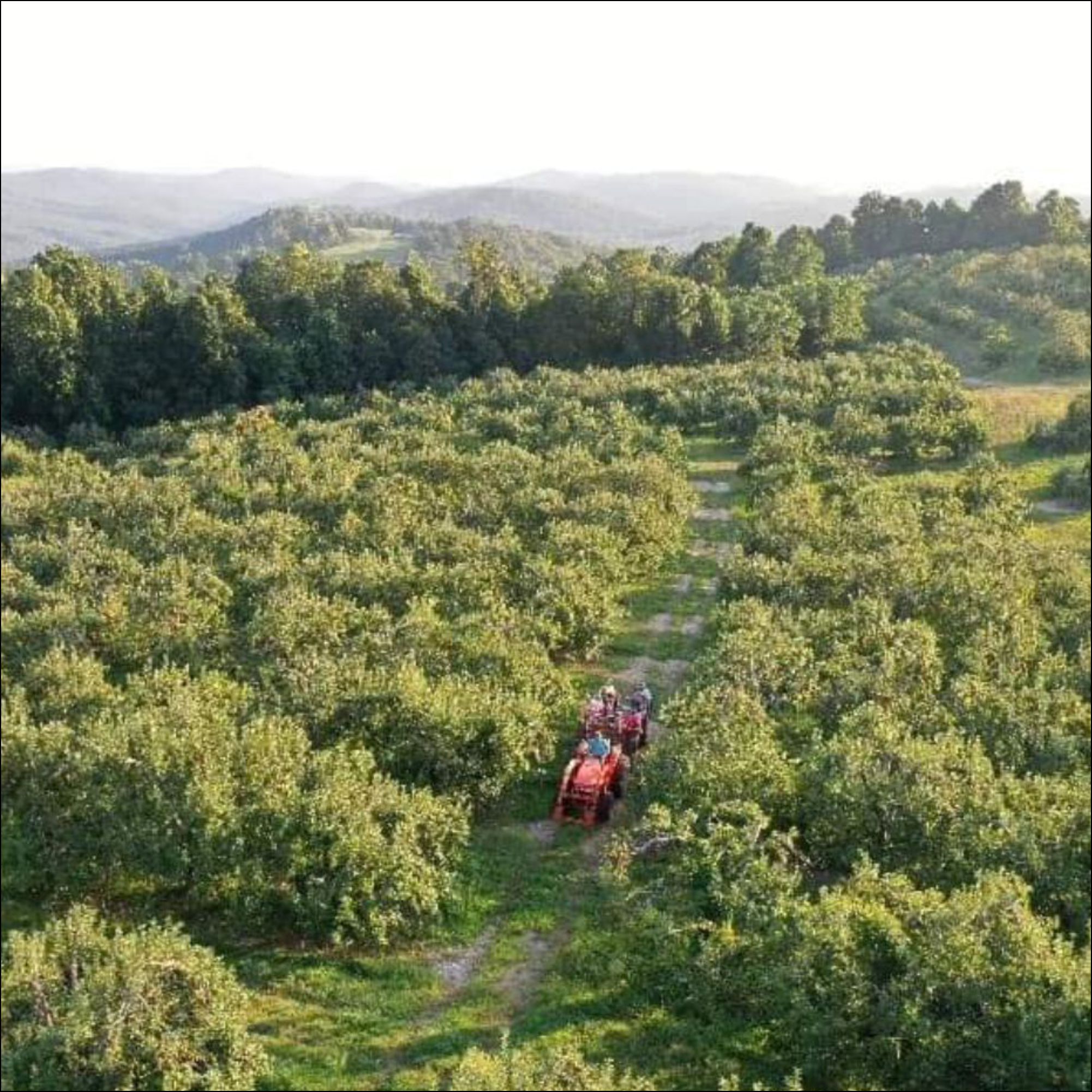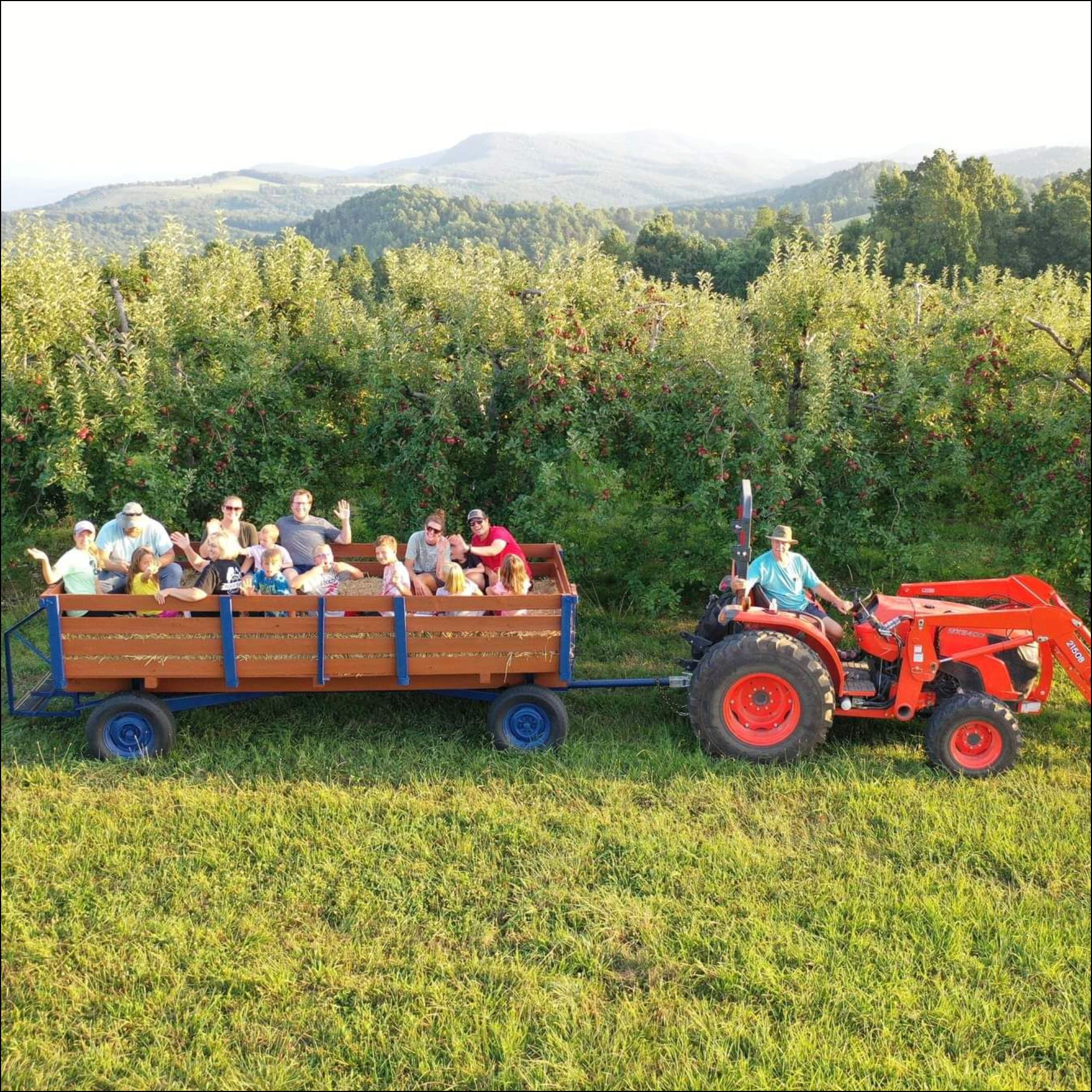 Guests climb aboard a tractor-drawn wagon and wind their way up to the top of Poplar Mountain—over 3,200 feet in elevation. Along the route, the ride passes through a working apple orchard, offering a slice of Appalachian farm life mixed with fresh mountain air and breathtaking viewpoints.