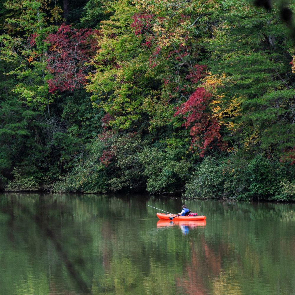 Enjoy fishing at a serene lake surrounded by beautiful mountains and forest. Fish on shore or fish from kayak or canoe.