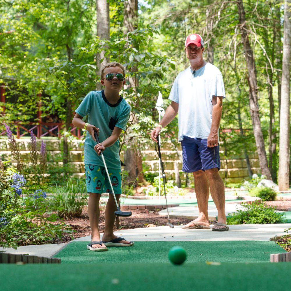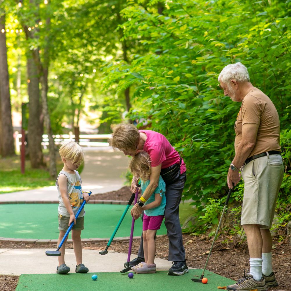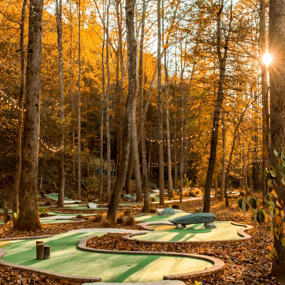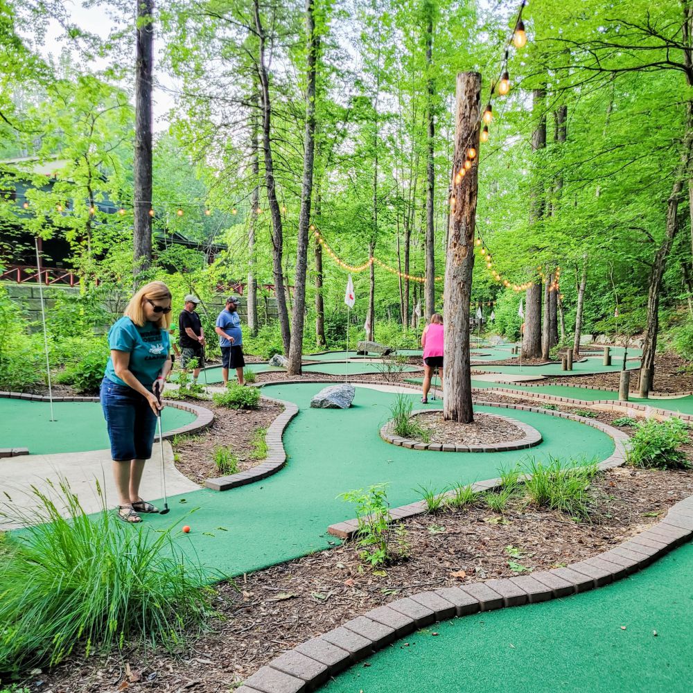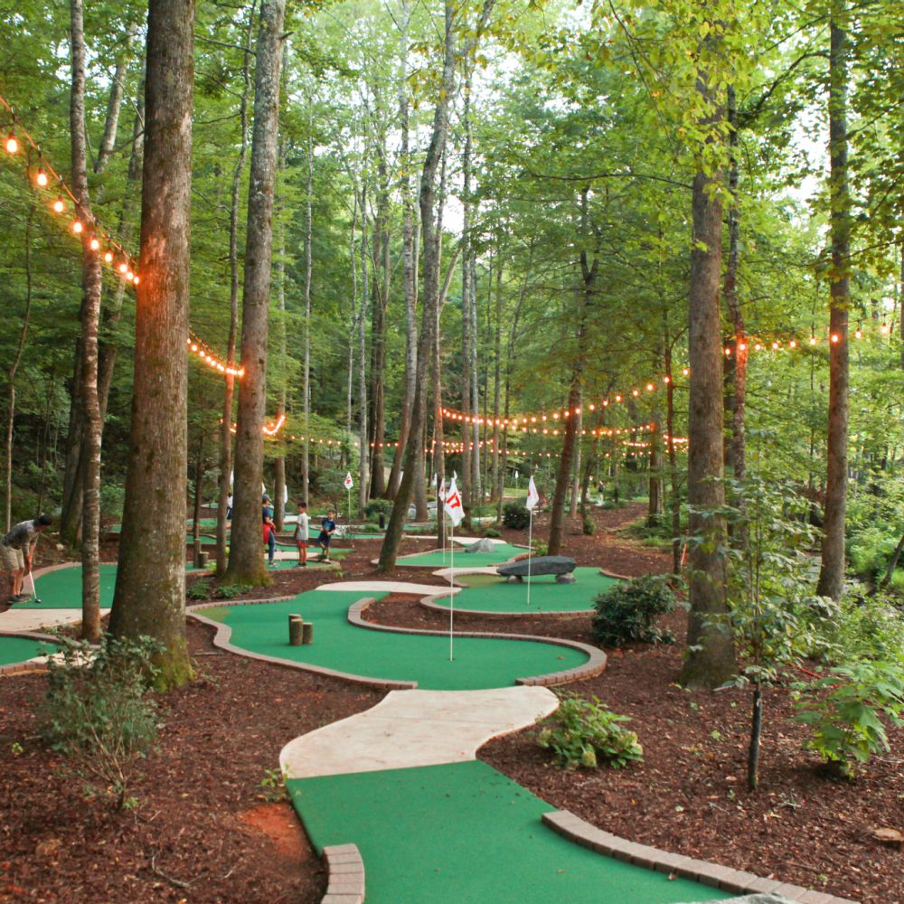 Tucked among tall trees and winding pathways, it creates a charming, forested setting perfect for friendly family competitions.