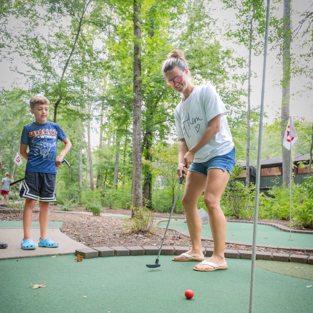The mini golf course at Yogi Bear’s Jellystone Park Golden Valley offers a playful and scenic escape for guests of all ages. Designed to blend seamlessly with the wooded surroundings, the course features lush greenery, gentle curves, and inviting paths that create a cozy, relaxed atmosphere. It’s an ideal stop for parents and kids alike to enjoy a bit of lighthearted competition while taking a break from the more high-energy attractions.