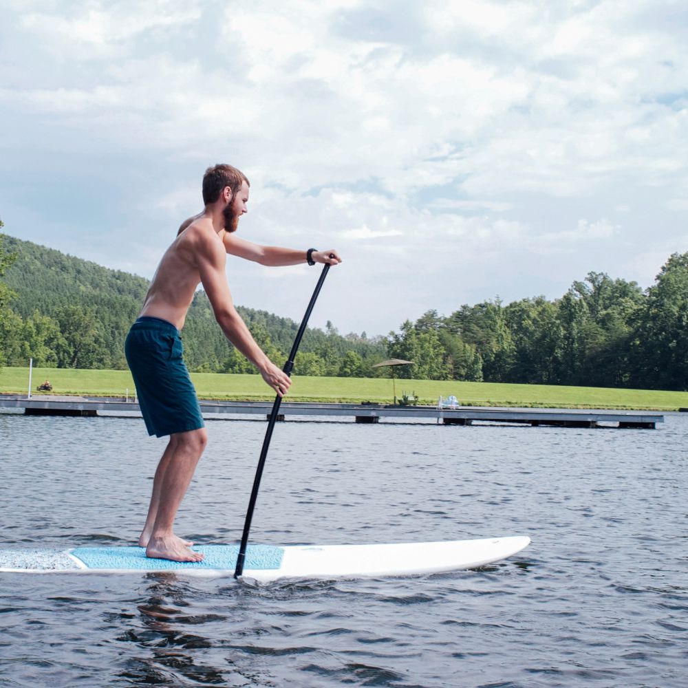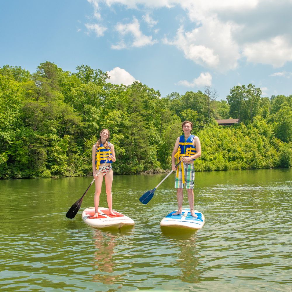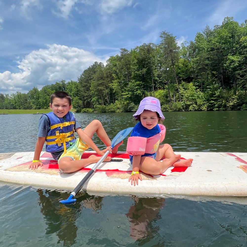 Paddleboarding at Jellystone Park Golden Valley is a great way for guests to enjoy the lake at a calm, relaxed pace. The lake is typically serene enough that even beginners can get out there without much trouble—it’s a nice blend of gentle balance, peaceful paddling, and natural scenery. Standing up on the board gives you a different perspective of the lake—watching the water ripple beneath, spotting fish or wildlife, maybe drifting near the floating obstacle course. It’s as much about having quiet, reflective time on the water as it is about exercise.